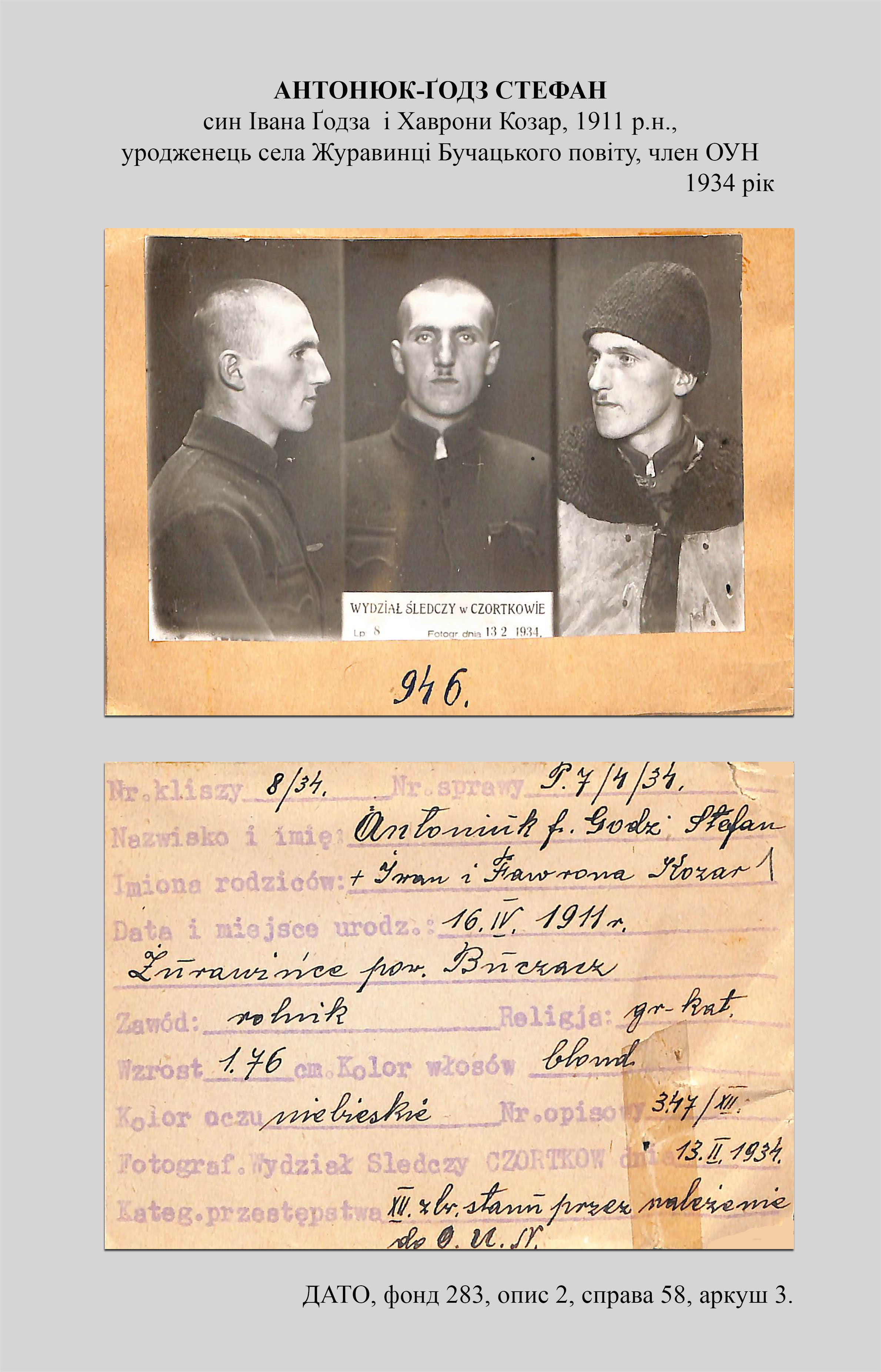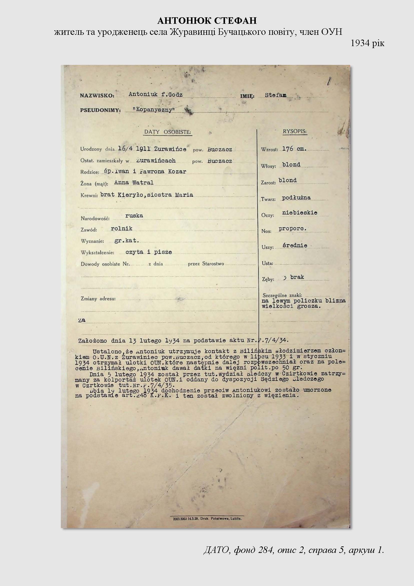 | 1 | АНТОНЮК СТЕФАН | житель та уродженець села Журавинці Бучацького повіту, член ОУН | 1934 рік | ДАТО, фонд 284, опис 2, справа 5, аркуш 1 |