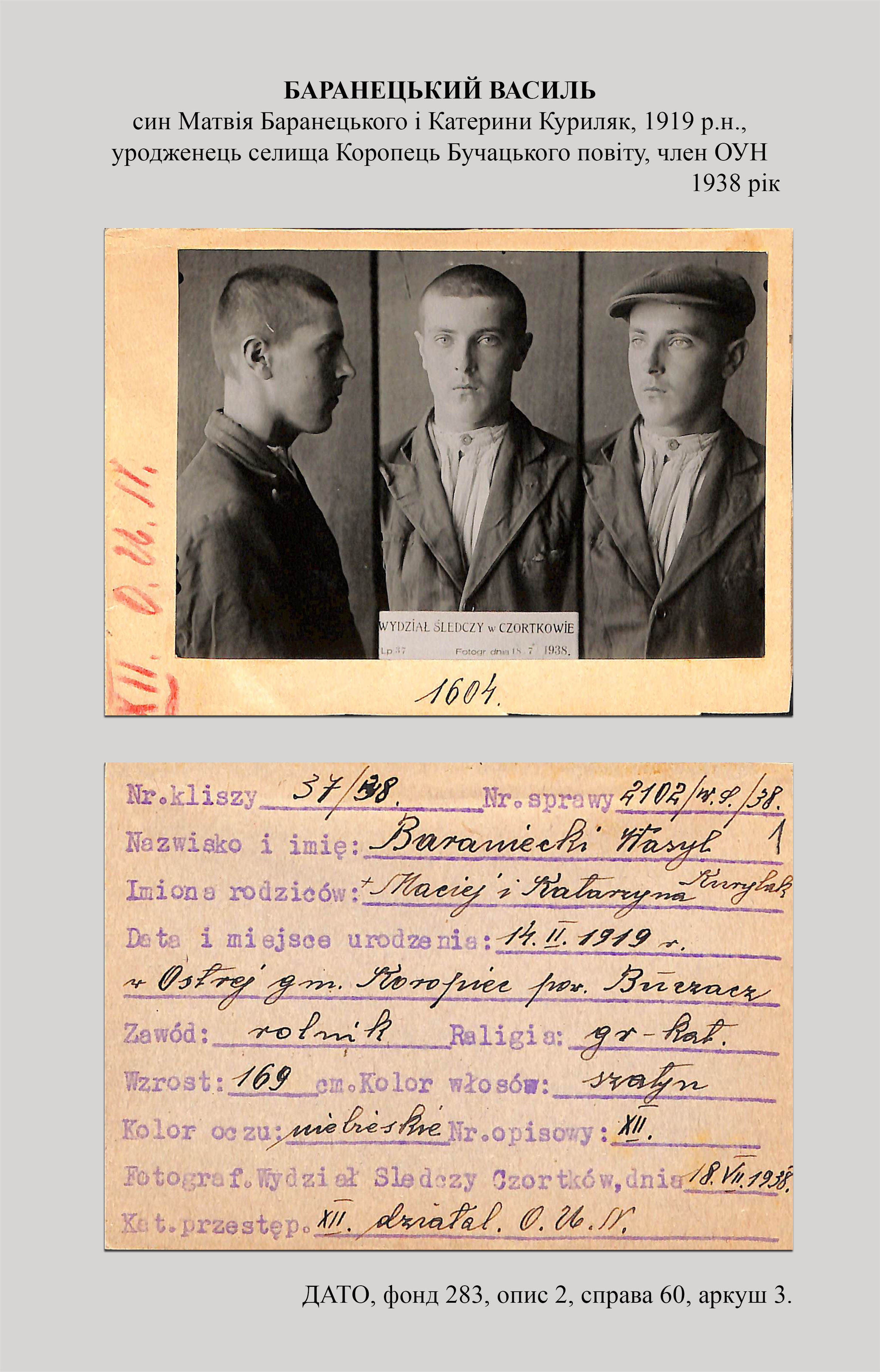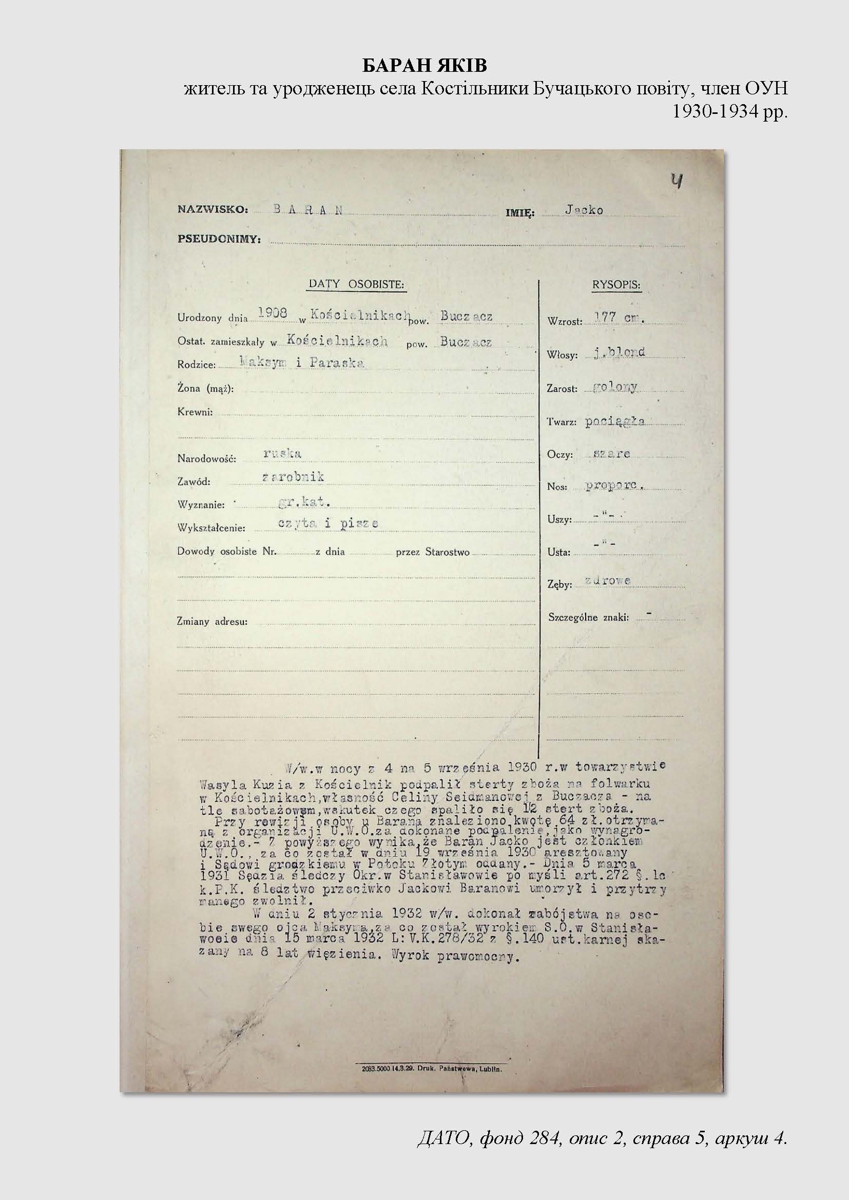 | 5 | БАРАН ЯКІВ | житель та уродженець села Костільники Бучацького повіту, член ОУН | 1930-1934 рр. | |