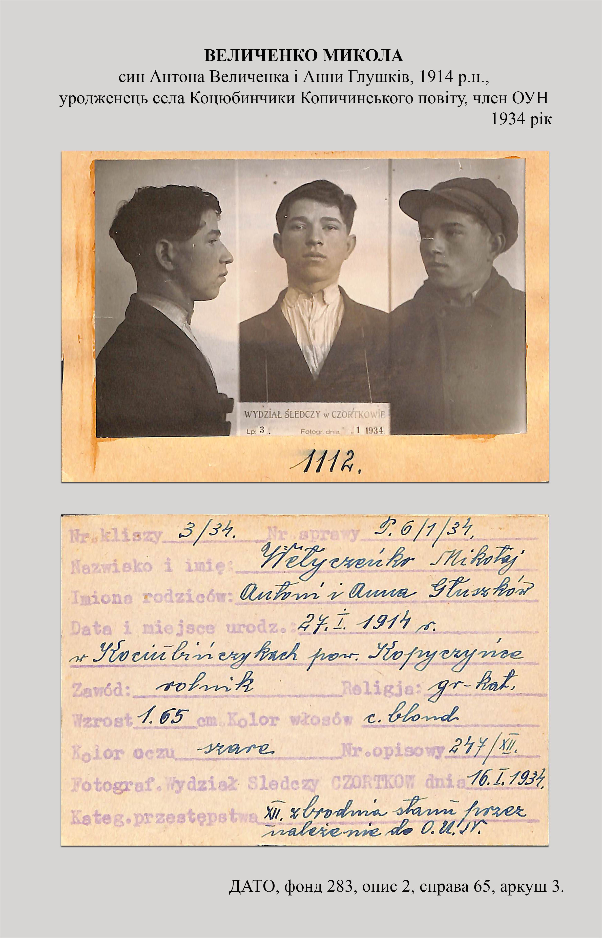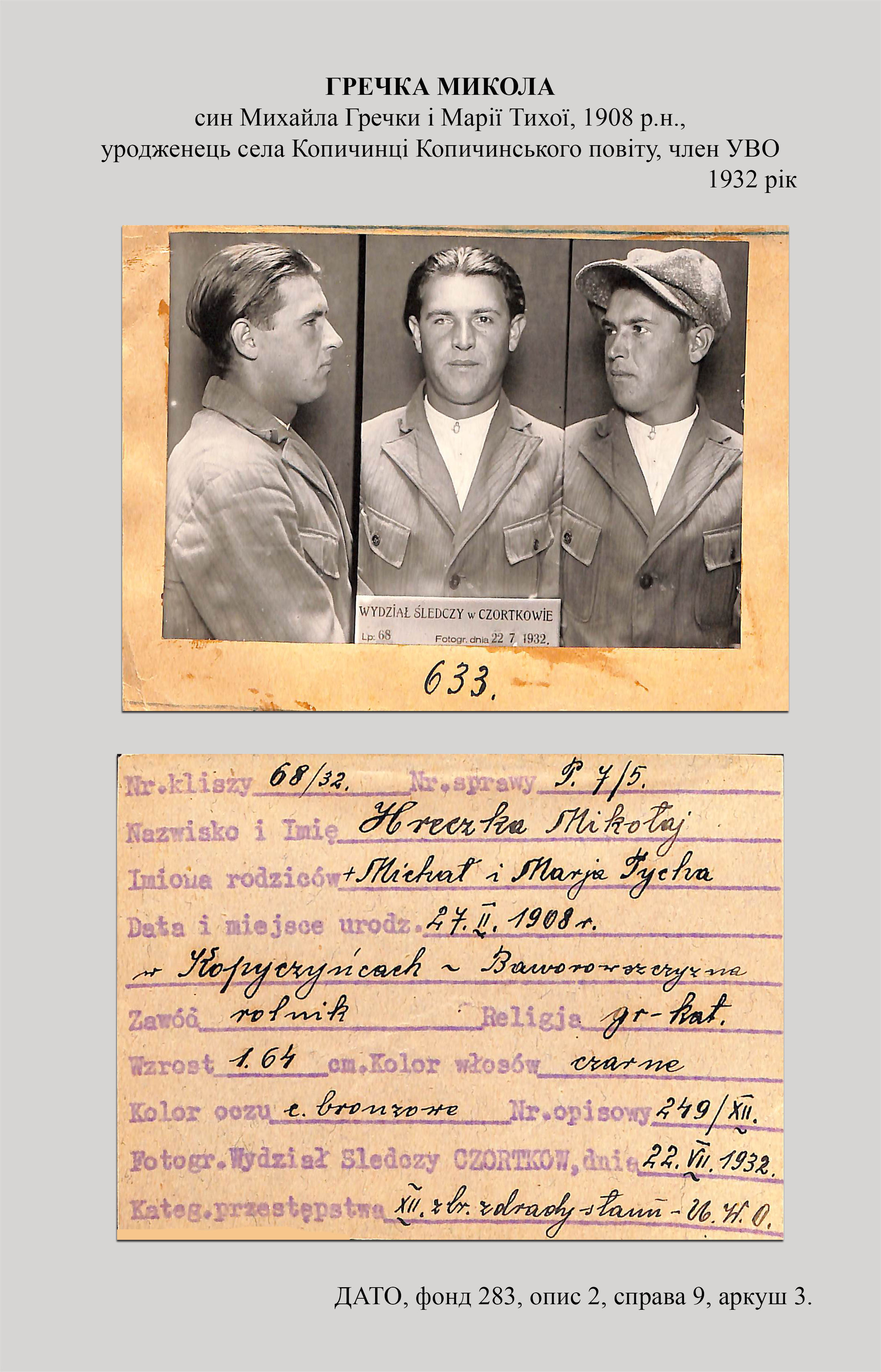 | 34 | ГРЕЧКА МИКОЛА | син Михайла Гречки і Марії Тихої, 1908 р.н., уродженець села Копичинці Копичинського повіту, член УВО | 1932 рік | ДАТО,фонд 283, опис 2, справа 9,аркуш 3. |