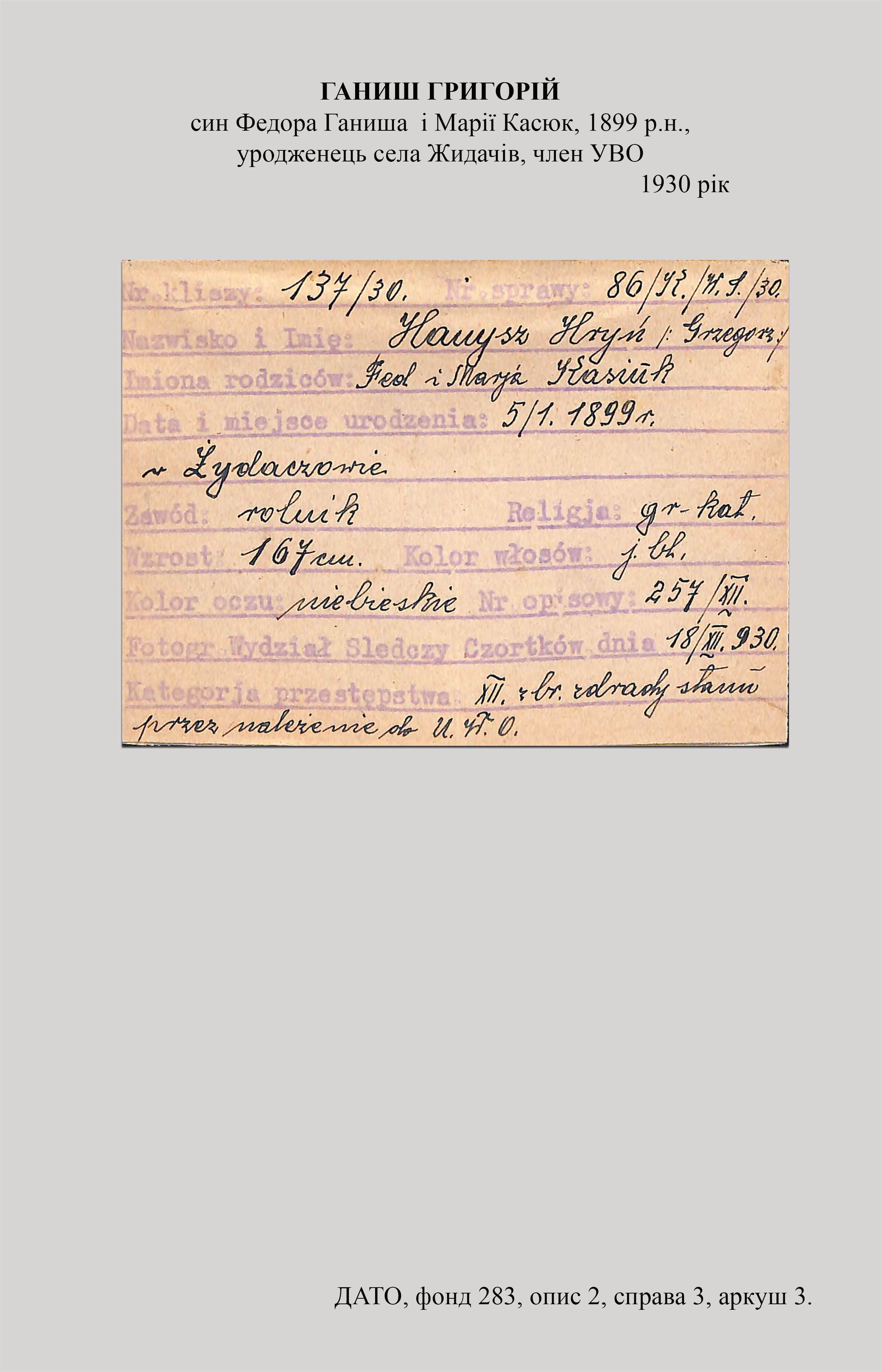 | 23 | ГАНИШ ГРИГОРІЙ | син Федора Ганиша і Марії Касюк, 1899 р.н., уродженець села Жидачів, член УВО | 1930 рік | ДАТО, фонд 283, опис 2, справа 3, аркуш 2. |