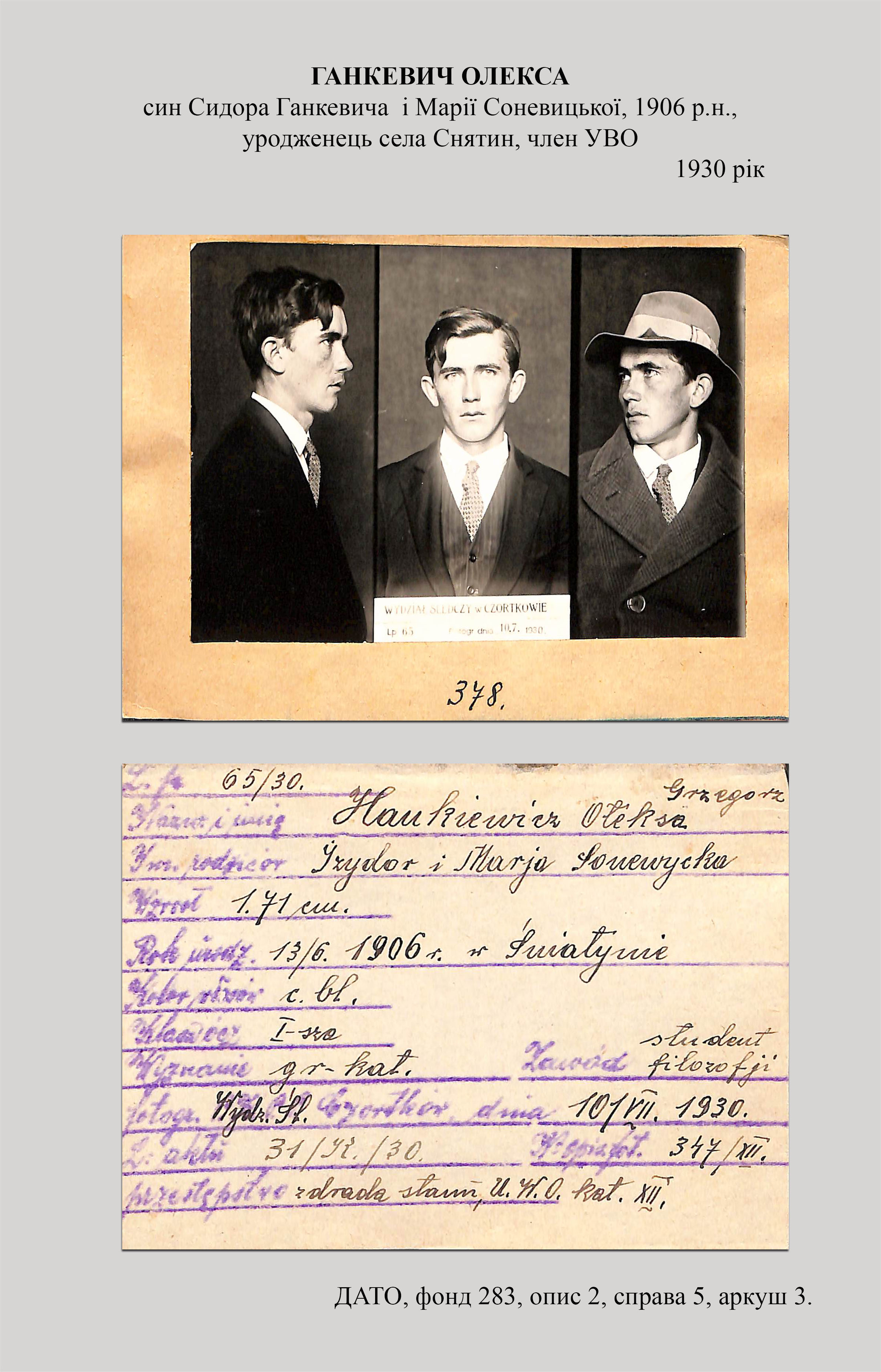 | 24 | ГАНКЕВИЧ ОЛЕКСА | син Сидора Ганкевича і Марії Соневицької, 1906 р.н., уродженець села Снятин, член УВО | 1930 рік | |