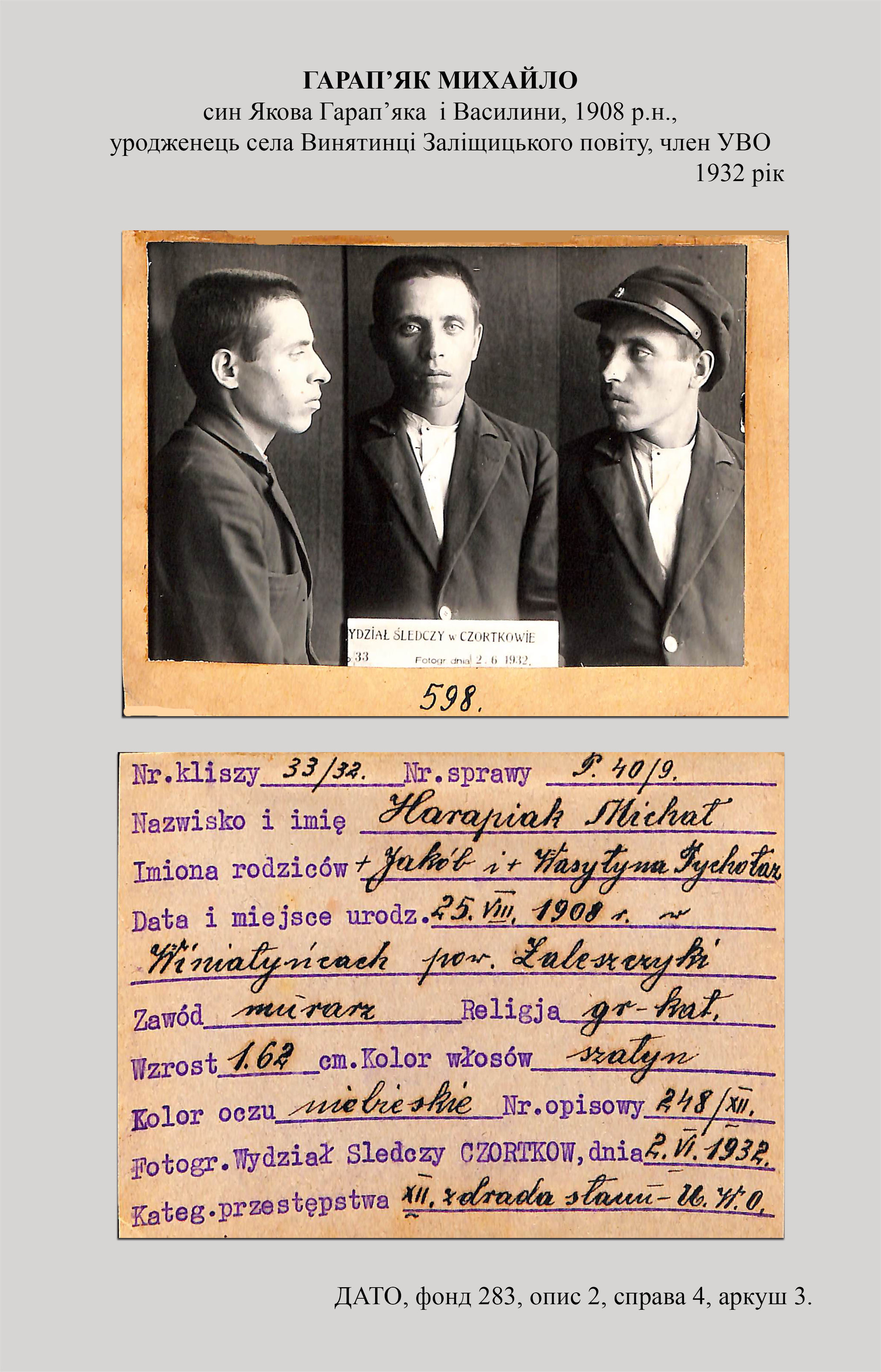 | 26 | ГАРАП’ЯК МИХАЙЛО | син Якова Гарап’яка і Василини, 1908 р.н., уродженець села Винятинці Заліщицького повіту, член УВО | 1932 рік | |