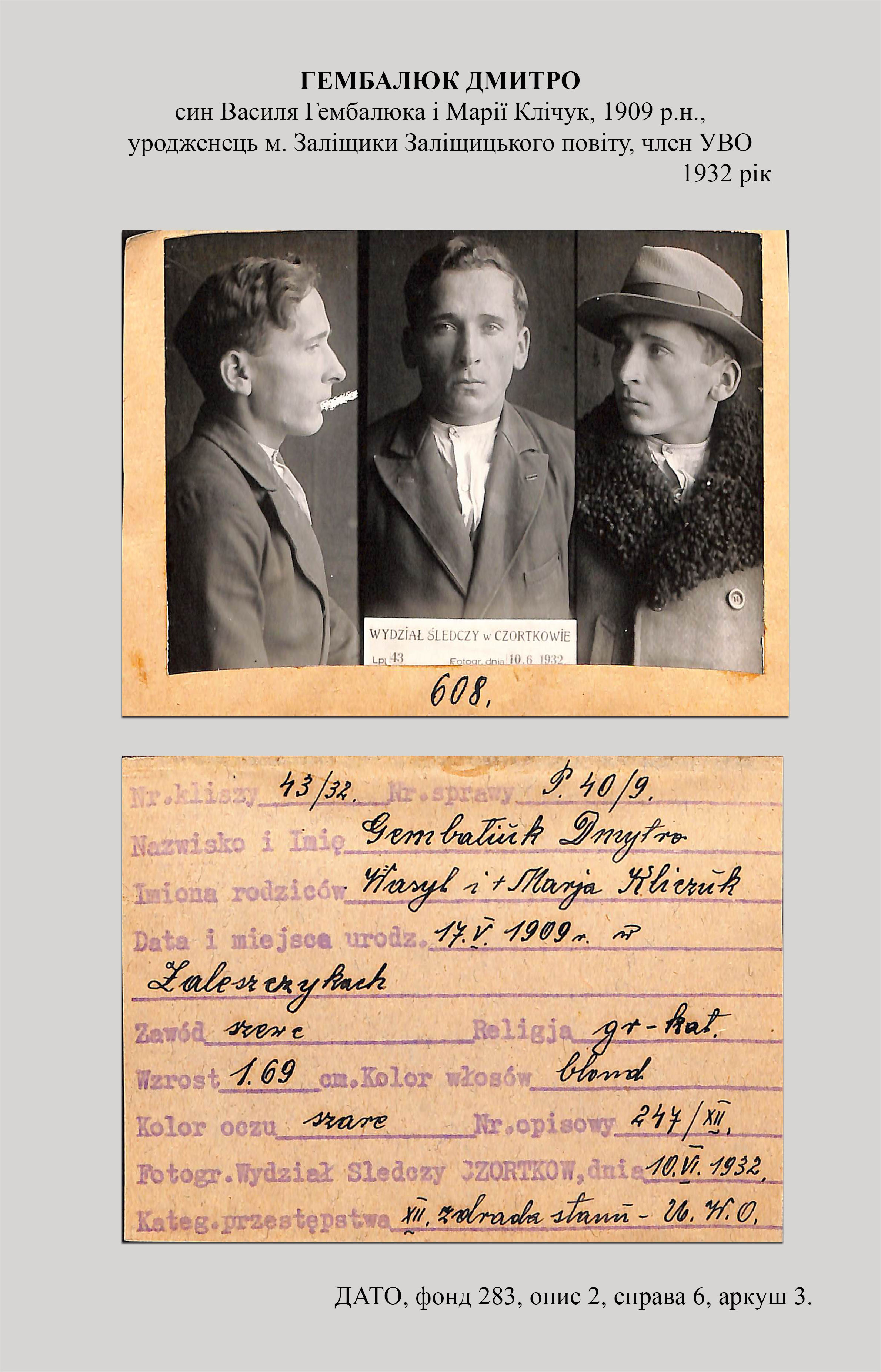 | 27 | ГЕМБАЛЮК ДМИТРО | син Василя Гембалюка і Марії Клічук, 1909 р.н., уродженець м. Заліщики Заліщицького повіту, член УВО | 1932 рік | |