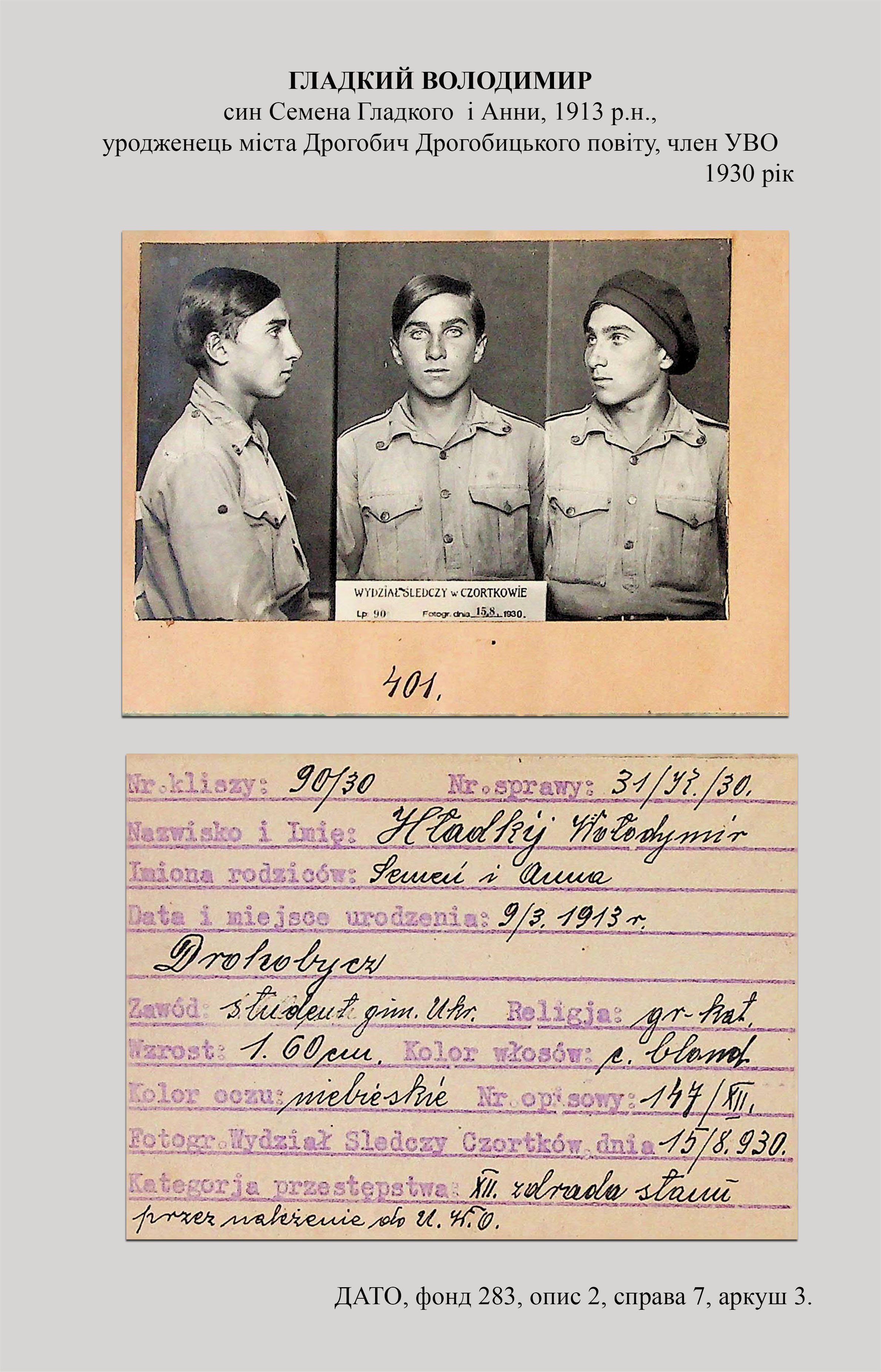 | 28 | ГЛАДКИЙ ВОЛОДИМИР | син Семена Гладкого і Анни, 1913 р.н., уродженець міста Дрогобич Дрогобицького повіту, член УВО | 1930 рік | ДАТО,фонд 283, опис 2, справа 7, аркуш 3. |