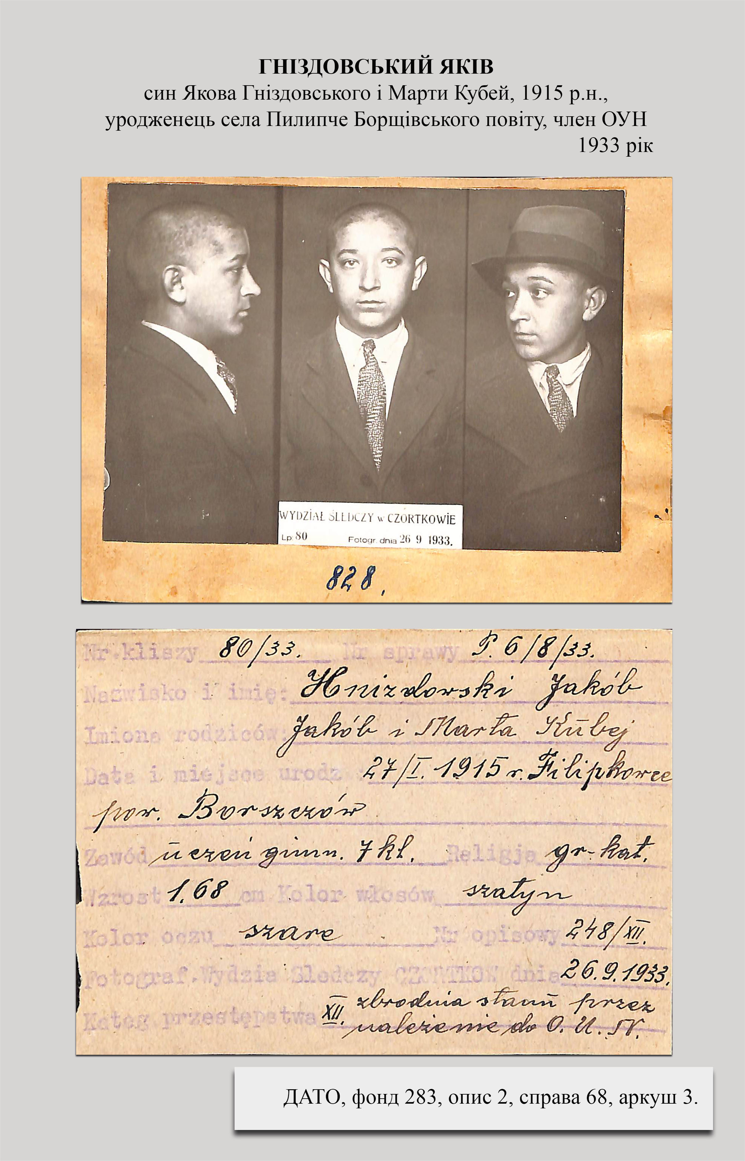 | 30 | ГНІЗДОВСЬКИЙ ЯКІВ | син Якова Гніздовського і Марти Кубей, 1915 р.н., уродженець села Пилипче Борщівського повіту, член ОУН | 1933 рік | |