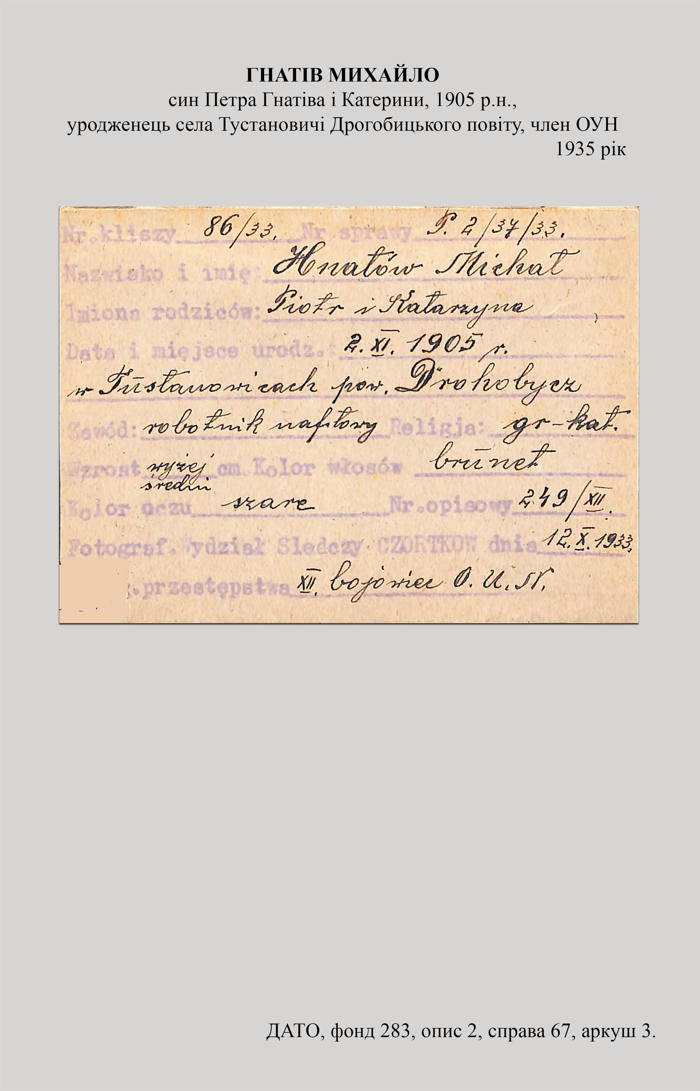 | 29 | ГНАТІВ МИХАЙЛО | син Петра Гнатіва і Катерини, 1905 р.н., уродженець села Тустановичі Дрогобицького повіту, член ОУН | 1935 рік | ДАТО,фонд 283, опис2, справа 67,аркуш 3. |