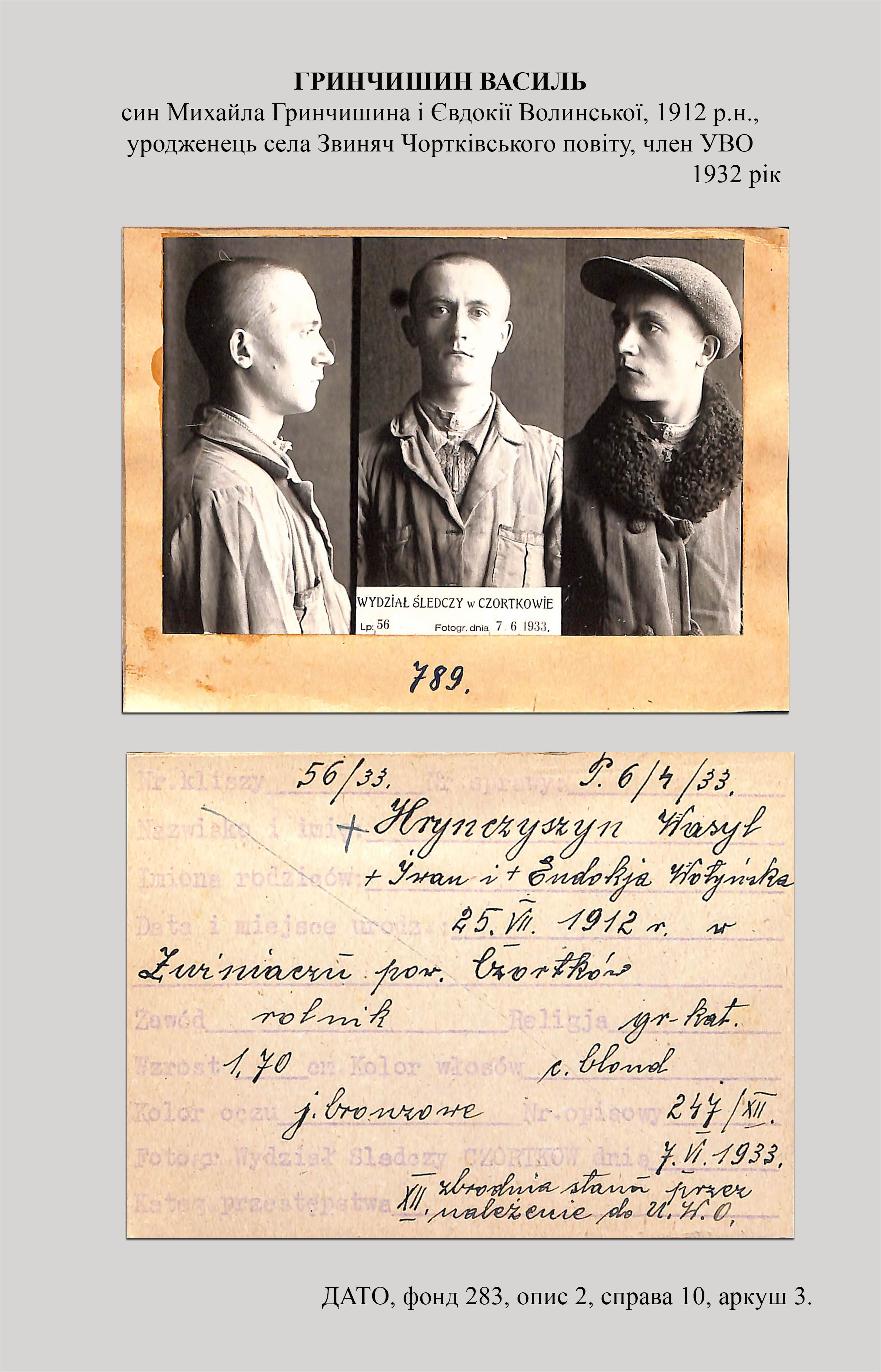 | 35 | ГРИНЧИШИН ВАСИЛЬ | син Михайла Гринчишина і Євдокії Волинської, 1912 р.н., уродженець села Звиняч Чортківського повіту, член УВО | 1932 рік | ДАТО,фонд 283, опис 2,справа 10,аркуш3. |