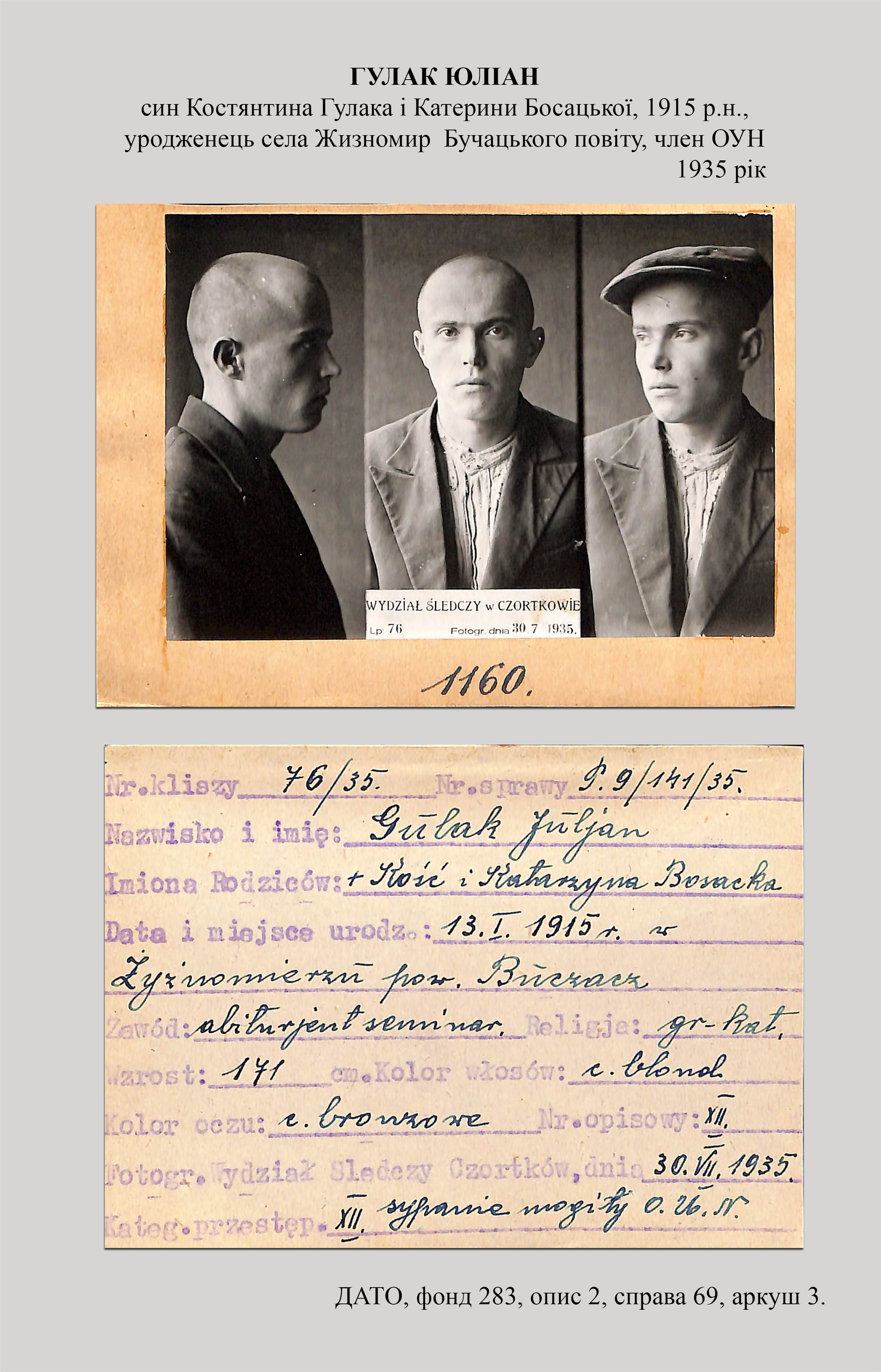 | 36 | ГУЛАК ЮЛІАН | син Костянтина Гулака і Катерини Босацької, 1915 р.н., уродженець села Жизномир Бучацького повіту, член ОУН | 1935 рік | ДАТО, фонд 283, опис 2, справа 69,аркуш3 |