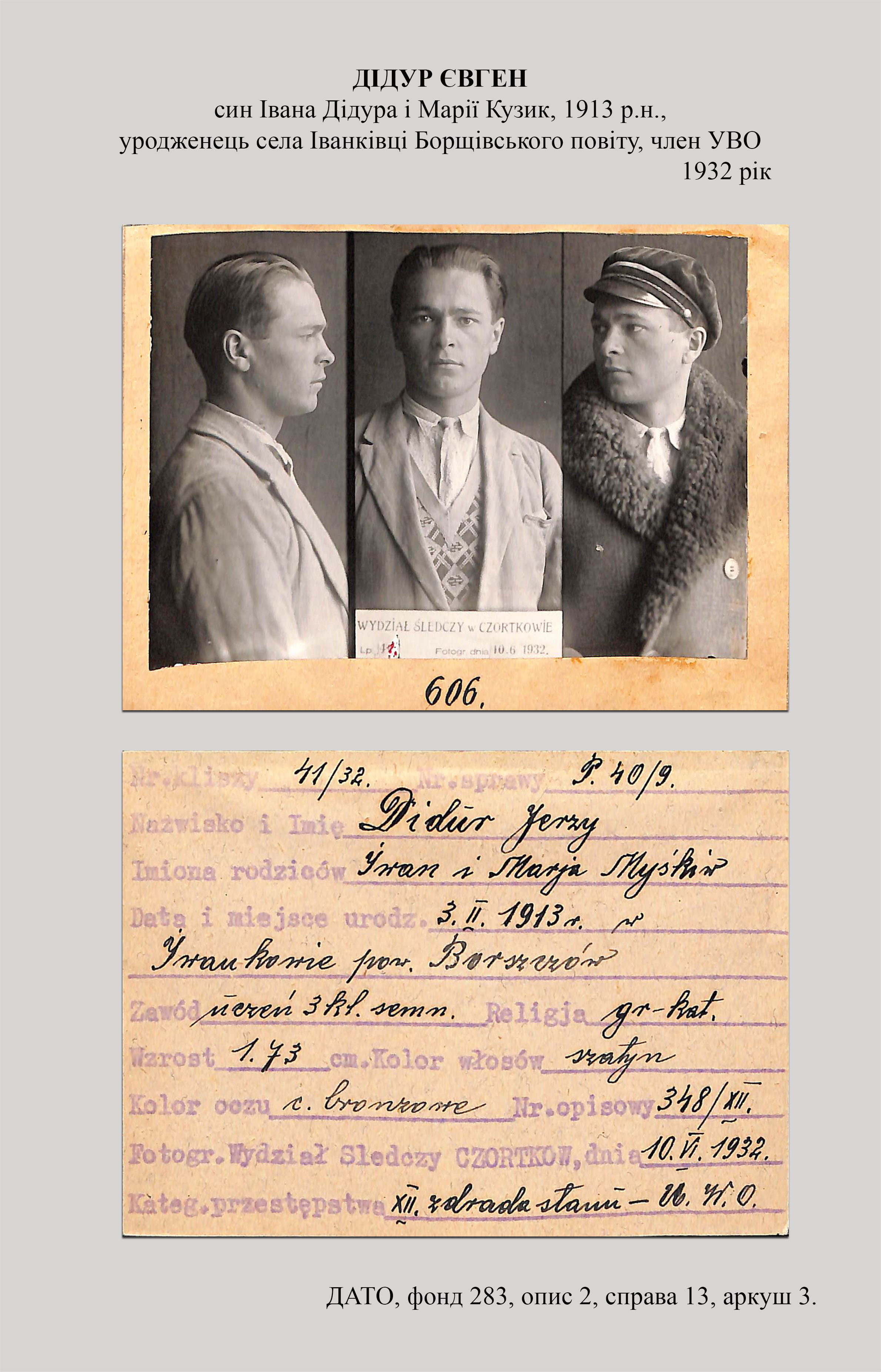 | 44 | ДІДУР ЄВГЕН | син Івана Дідура і Марії Кузик, 1913 р.н., уродженець села Іванківці Борщівського повіту, член УВО | 1932 рік | ДАТО, фонд 283, опис 2, справа 13,аркуш 3 |