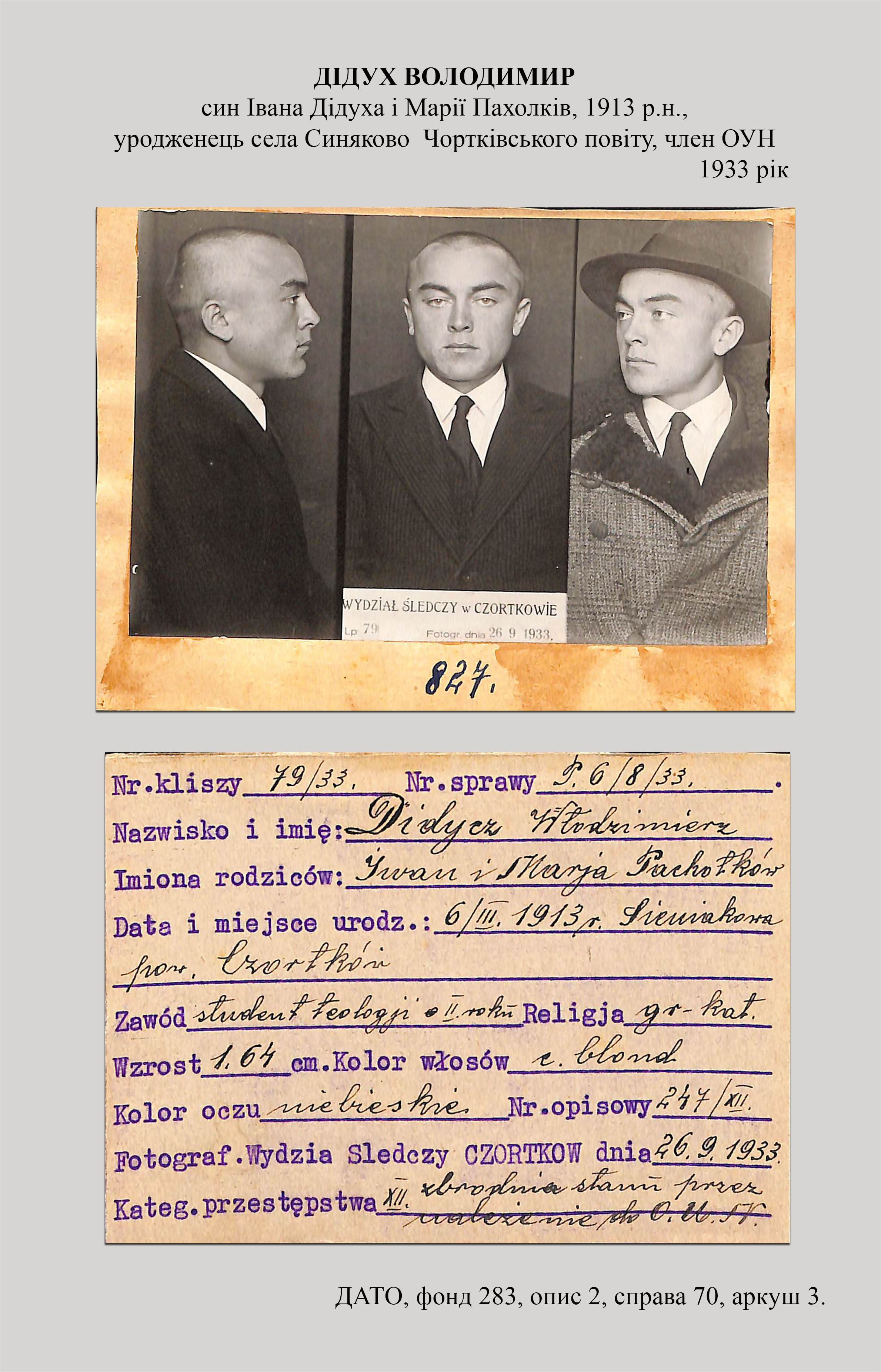 | 45 | ДІДУХ ВОЛОДИМИР | син Івана Дідуха і Марії Пахолків, 1913 р.н., уродженець села Синяково Чортківського повіту, член ОУН | 1933 рік | ДАТО, фонд 283, опис 2, справа 70,аркуш 3 |