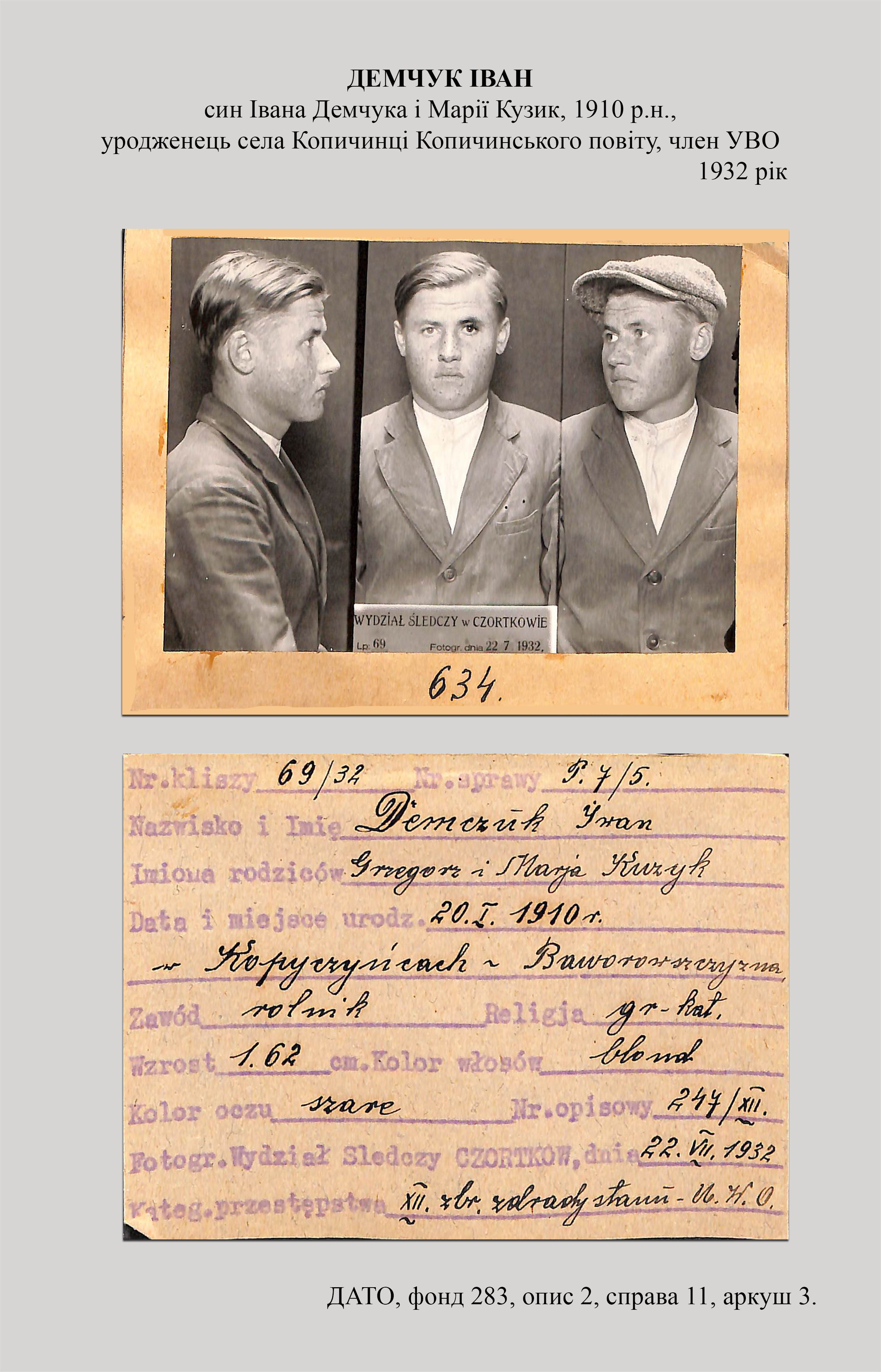 | 41 | ДЕМЧУК ІВАН | син Івана Демчука і Марії Кузик, 1910 р.н., уродженець села Копичинці Копичинського повіту, член УВО | 1932 рік | ДАТО, фонд 283, опис 2, справа11, аркуш3 |
