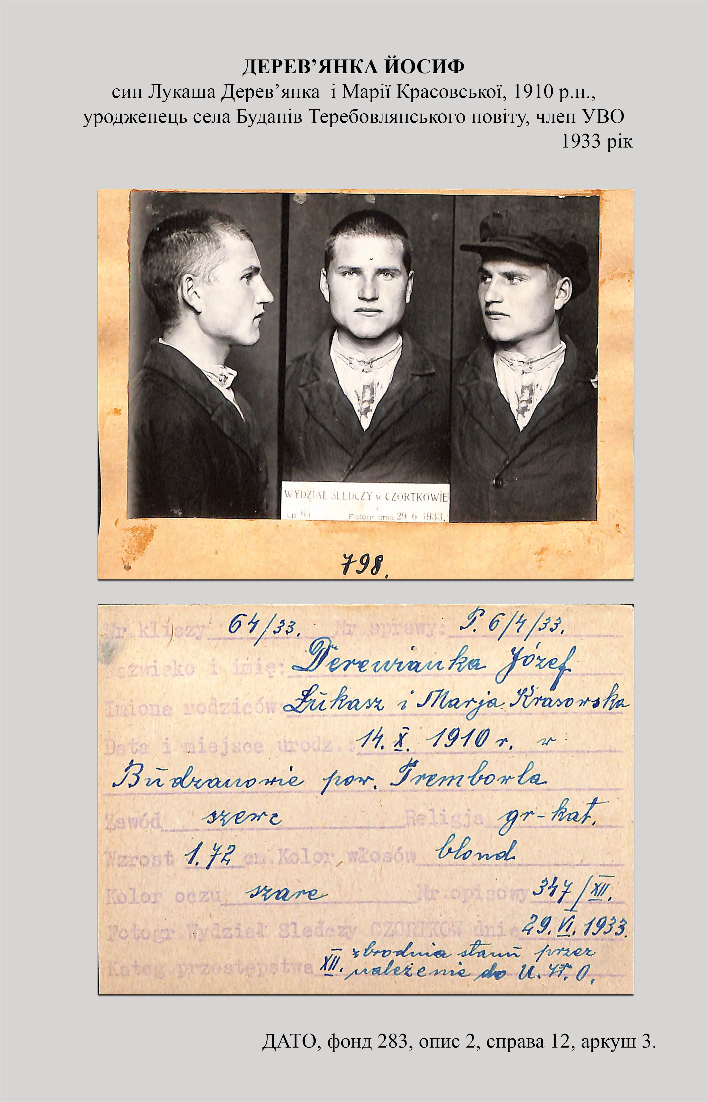| 42 | ДЕРЕВ’ЯНКА ЙОСИФ | син Лукаша Дерев’янка і Марії Красовської, 1910 р.н., уродженець села Буданів Теребовлянського повіту, член УВО | 1933 рік | ДАТО, фонд 283, опис 2, справа12,аркуш 3 |