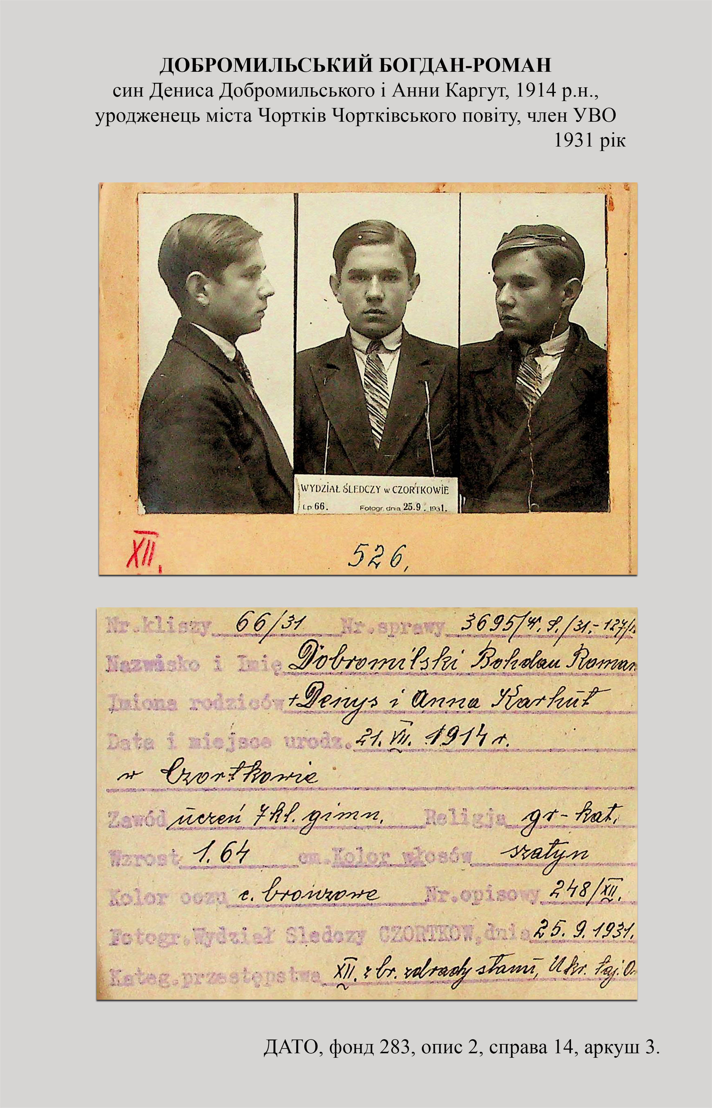 | 46 | ДОБРОМИЛЬСЬКИЙ БОГДАН-РОМАН4 | син Дениса Добромильського і Анни Каргут, 1914 р.н., уродженець міста Чортків Чортківського повіту, член УВО | 1931 рік | ДАТО, фонд 283, опис 2, справа 14,аркуш 3 |