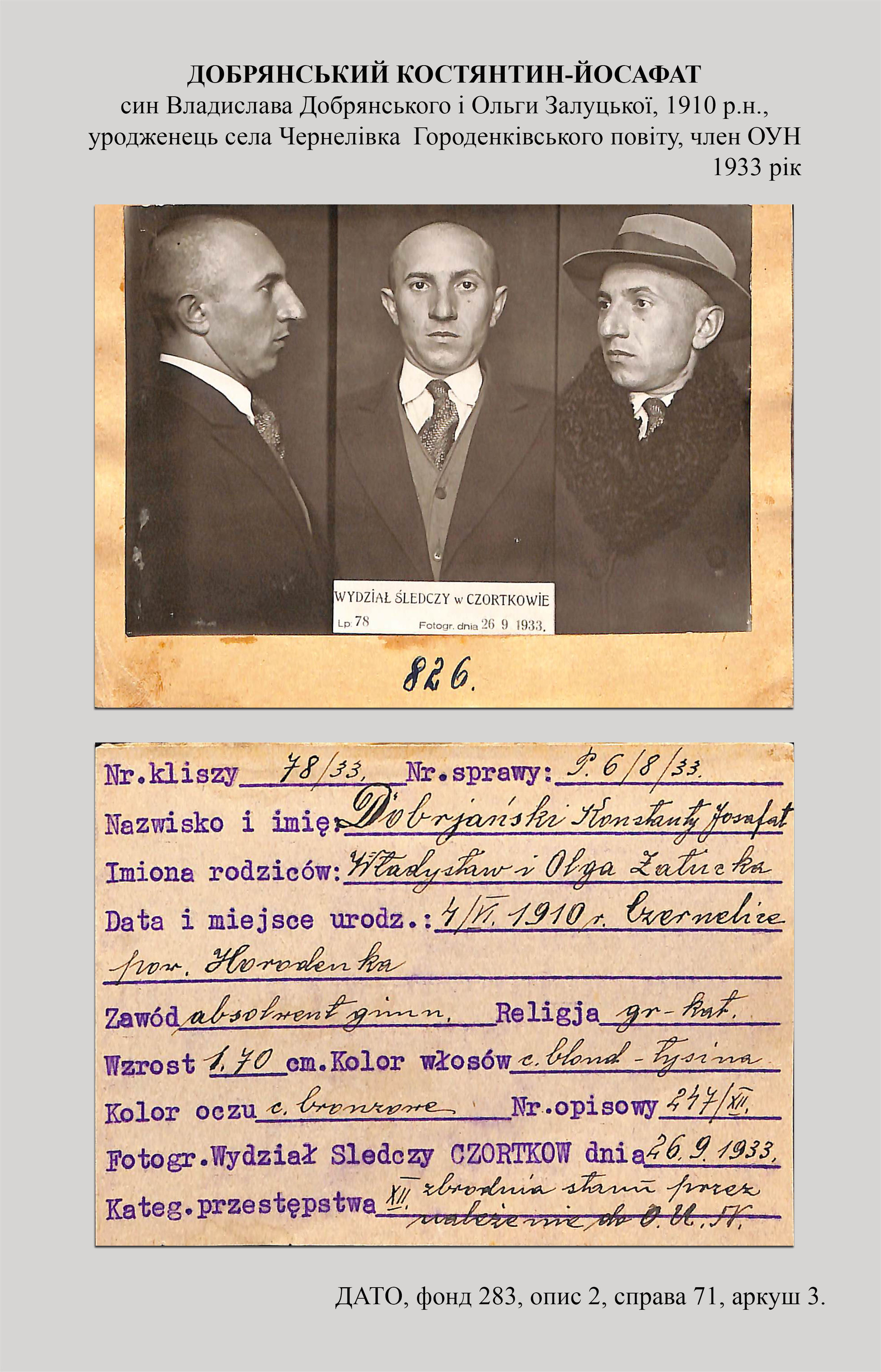 | 47 | ДОБРЯНСЬКИЙ КОСТЯНТИН-ЙОСАФАТ | син Владислава Добрянського і Ольги Залуцької, 1910 р.н., уродженець села Чернелівка Городенківського повіту, член ОУН | 1933 рік | ДАТО, фонд 283, опис 2, справа 71,аркуш 3 |