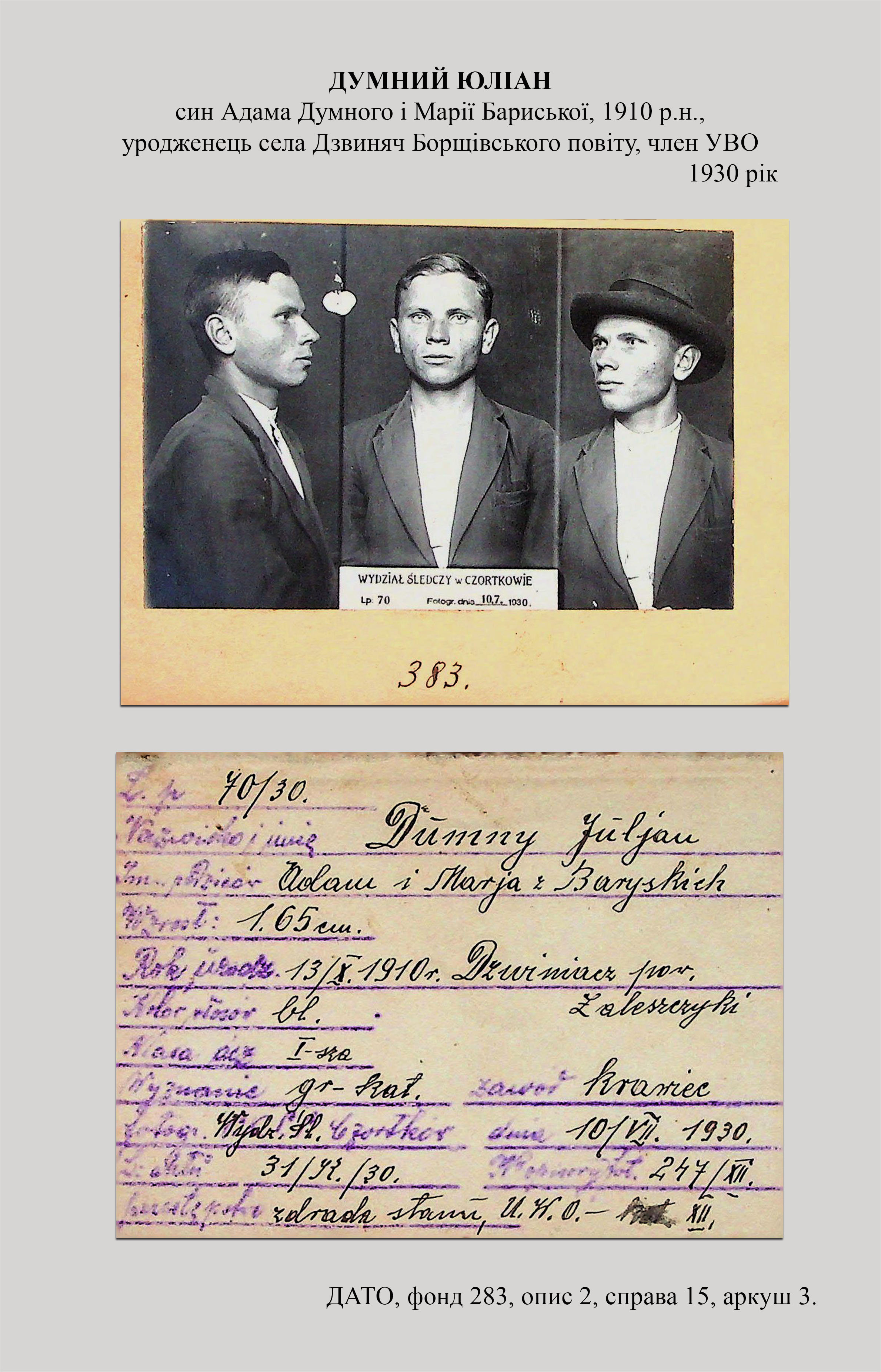 | 48 | ДУМНИЙ ЮЛІАН | син Адама Думного і Марії Бариської, 1910 р.н., уродженець села Дзвиняч Борщівського повіту, член УВО | 1930 рік | ДАТО,фонд 283, опис 2, справа 15, аркуш 3 |